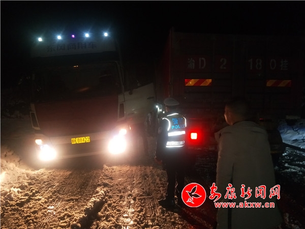 1月6日至8日鎮(zhèn)坪持續(xù)大到暴雪天氣,雞心嶺路段因海拔較高,積雪結(jié)冰嚴(yán)重,導(dǎo)致30余輛大型貨車滯留。鎮(zhèn)坪交警及時上山疏導(dǎo)交通,對發(fā)生緊急情況的車輛進行救援,并對未采取防滑措施的車輛進行勸返,截至1月8日上午11時交警仍然在該路段進行救援工作。(圖文/趙榮鵬)JxD安康新聞網(wǎng)