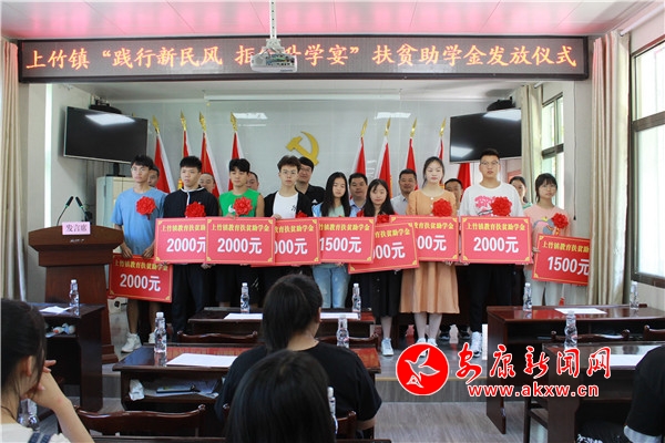 在升學(xué)禮上,宣讀了《上竹鎮(zhèn)2020年度“踐行新民風(fēng)•不辦升學(xué)宴”教育扶貧助學(xué)活動(dòng)實(shí)施方案》,按照一本2000元,二本1500元的標(biāo)準(zhǔn)為18學(xué)生發(fā)放了扶貧助學(xué)金,共計(jì)30500元。學(xué)生代表印想想發(fā)言,她表示,堅(jiān)決向“升學(xué)宴”“謝師宴”說不,自己會(huì)更加努力學(xué)習(xí),不負(fù)眾望,知恩感恩,做文明新風(fēng)的倡導(dǎo)者。學(xué)生家長(zhǎng)代表陳昌瓊在儀式上發(fā)言,將一如既往地弘揚(yáng)新民風(fēng),自覺抵制大操大辦、鋪張浪費(fèi),做移風(fēng)易俗的踐行者。在活動(dòng)現(xiàn)場(chǎng),學(xué)生家長(zhǎng)也倍感自豪,臉上洋溢著幸福的笑容,紛紛表示,黨委政府通過開展新穎的慶;顒(dòng),給孩子們留下珍貴的記憶,既達(dá)到了革除陋習(xí)的目的,讓“里子”好,又讓百姓“面子”亮。