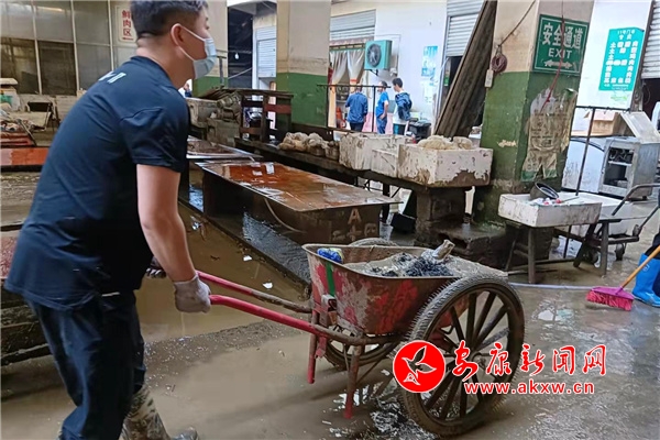 在自救的同時(shí),9月20日起,縣市場監(jiān)管局的干部們同步投入到重災(zāi)區(qū)農(nóng)貿(mào)市場的清淤工作中。在此次災(zāi)情中,農(nóng)貿(mào)市場受災(zāi)最為嚴(yán)重,各類設(shè)施受損嚴(yán)重,垃圾污泥成片,污水橫流,一片狼藉,完全不能投入使用。在農(nóng)貿(mào)市場,大家自帶工具集中投入到這場農(nóng)貿(mào)市場“美容戰(zhàn)”中,加緊清理淤泥、疏通水渠、打掃地面。 淤泥太厚了,他們就用刮板推;水渠堵了,他們就用手去疏通;地面太臟了,他們就用沖水管去沖;污泥流不出去,他們就用小推車一車一車地運(yùn).......面對(duì)受災(zāi)的商戶,干部們認(rèn)真做好安撫,鼓勵(lì)經(jīng)營戶重拾信心,重建美麗家園。