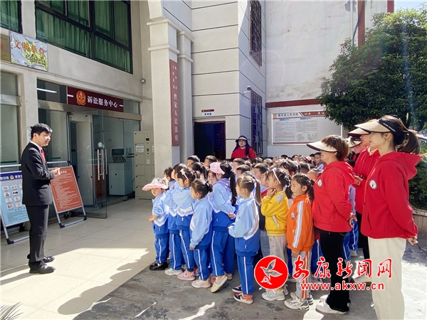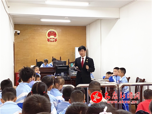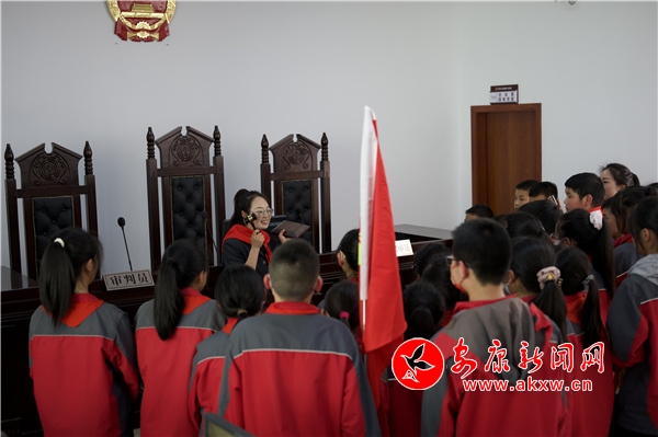 在參觀過程中,干警帶領(lǐng)同學(xué)們走進(jìn)訴訟服務(wù)中心和干警辦公室了解了法院干警的工作場(chǎng)所。隨后,帶領(lǐng)同學(xué)們參觀審判庭,現(xiàn)場(chǎng)向同學(xué)們介紹科技審判法庭的功能及庭審流程,并展示了法袍、法槌和法徽,同時(shí)用深入淺出的語言和提問互動(dòng)的方式向孩子們講解了法袍、法槌和法徽的象征意義,同學(xué)們興趣濃厚,紛紛走上審判臺(tái),親身感受和觸摸審判設(shè)施,感受法庭審判的嚴(yán)肅和莊重。