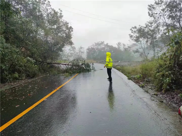 310省道38KM+800M因大雨造成大樹倒塌占據(jù)半幅道路。