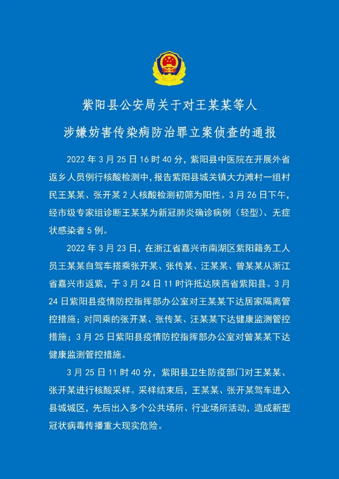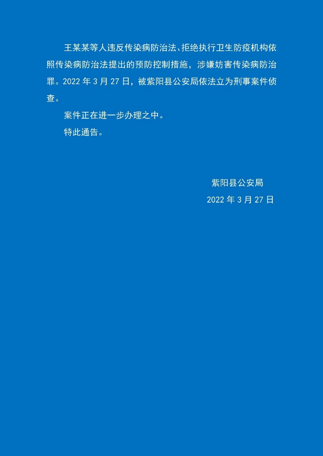 紫陽縣公安局關(guān)于對王某某等人涉嫌妨害傳染病防治罪立案偵查的通報(bào)