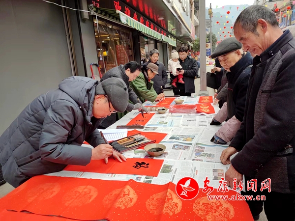本網(wǎng)訊(通訊員 葉柏成)喜慶的佳節(jié)將到來,火紅的春聯(lián)寫起來。1月30日,紫陽縣麻柳鎮(zhèn)集鎮(zhèn)街道,人頭攢動。在中街的義務(wù)寫春聯(lián)活動,正在如火如荼地進行著,受麻柳鎮(zhèn)政府邀請,由紫陽縣文聯(lián)、紫陽縣老年大學共同組織老年書法班的學員,為該鎮(zhèn)群眾義務(wù)書寫春聯(lián),在傳統(tǒng)佳節(jié)到來之際,為老百姓送上火紅溫馨的祝福。
