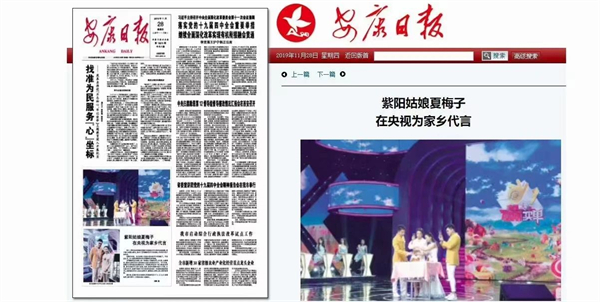 夏梅子曾登上央視宣傳過安康富硒茶,她在CCTV-3綜藝頻道《幸福賬單》欄目演唱陜南民歌并介紹了紫陽富硒茶(綠茶、紅茶)、紫陽金錢橘、紫陽魔芋干、紫陽硒陶等紫陽特產(chǎn)。在才藝展示環(huán)節(jié),夏梅子演唱了由著名作家、書法家、中國作家協(xié)會會員、陜西省民間文藝家協(xié)會專家?guī)斐蓡T曾德強老師創(chuàng)作的《游客醉茶鄉(xiāng)》,她希望更多的人關(guān)注和支持家鄉(xiāng),能夠愛上安康紫陽,愛上紫陽富硒茶。