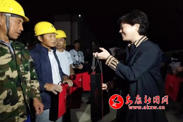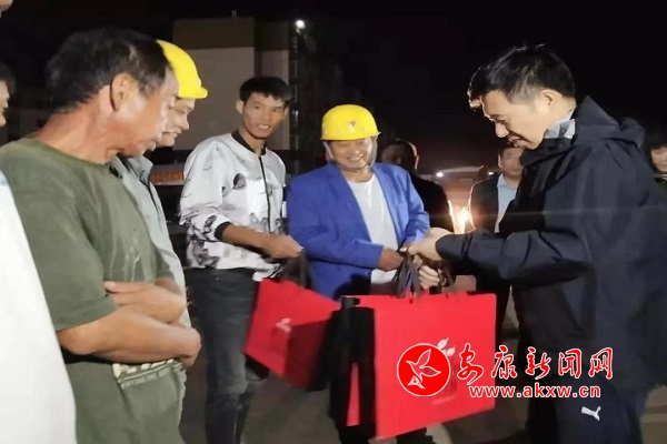 在深夜的施工現(xiàn)場(chǎng),郭青向工人和基層干部送上了月餅等慰問(wèn)品,對(duì)他們?cè)谥星锛压?jié)期間依然堅(jiān)守工作崗位的敬業(yè)精神和舍小家顧大家的奉獻(xiàn)精神表示崇高敬意,叮囑大家一定要注意身體健康和夜間施工安全。