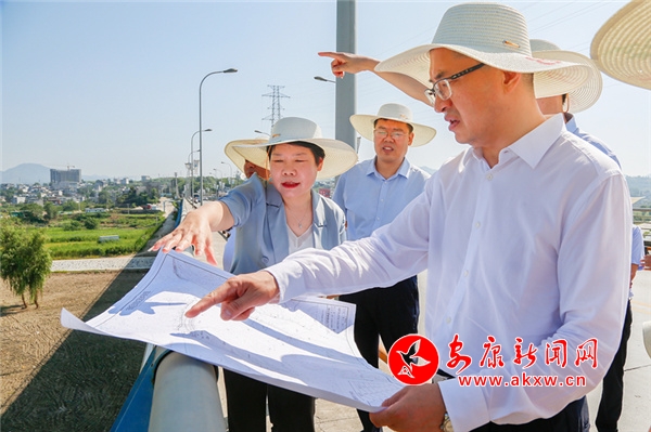 市長王浩(右一)調(diào)研棗園片區(qū)防洪保安工作和張灘集鎮(zhèn)漢江綜合整治項(xiàng)目建設(shè)情況。