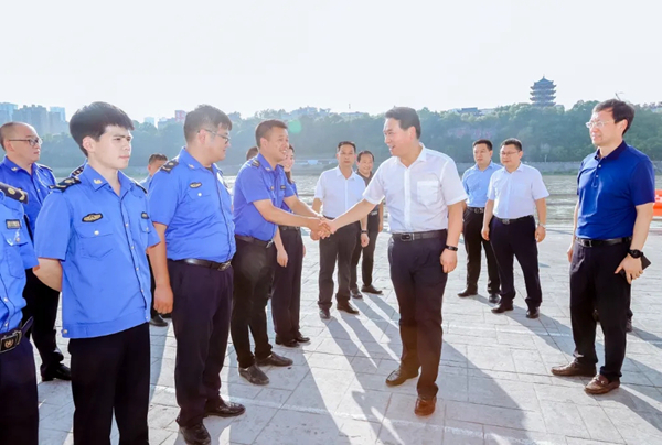 在安康龍舟文化園,趙俊民督導(dǎo)漢江禁洗工作,看望漢江中心城區(qū)段環(huán)境保護工作人員,并送去防暑降溫慰問品,叮囑他們在開展河道洗滌勸導(dǎo)活動的同時,注意防暑降溫、保重身體。
