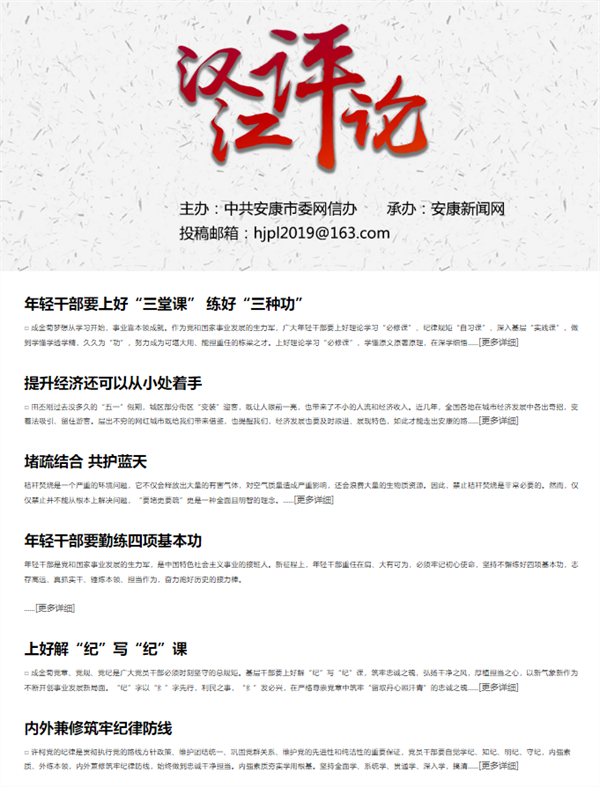三是圍繞省委、市委“三個(gè)年”活動部署,網(wǎng)站開設(shè)“一把手開麥——聚焦‘三個(gè)年’”專欄,聚焦我市“高質(zhì)量項(xiàng)目推進(jìn)年、營商環(huán)境突破年、干部作風(fēng)能力提升年”主題報(bào)道,為推進(jìn)安康高質(zhì)量項(xiàng)目發(fā)展、助力擦亮“營商環(huán)境最安康”金字招牌、提升全市干部作風(fēng)能力,營造濃厚良好輿論氛圍。