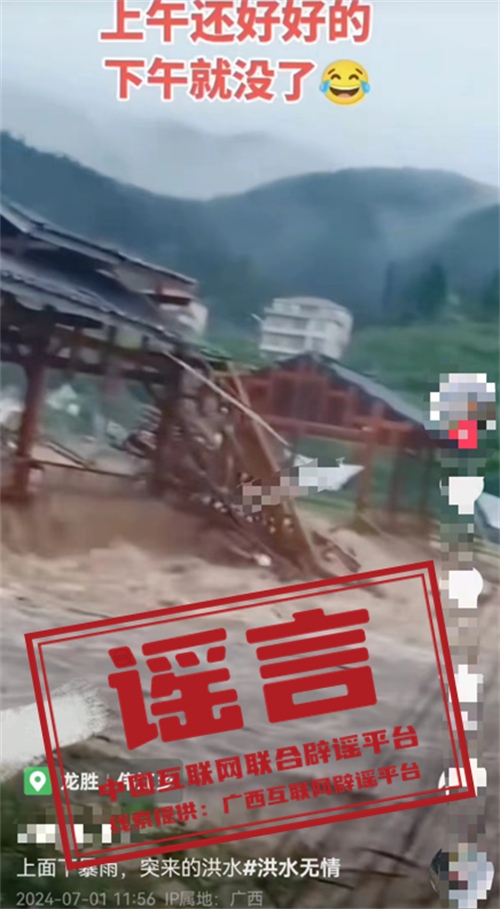 詳情:近日,有網(wǎng)民發(fā)布視頻稱“桂林龍勝一風(fēng)雨橋被洪水沖毀”,并配文“上午還好好的,下午就沒了”,引發(fā)關(guān)注。經(jīng)當(dāng)?shù)毓膊块T核實(shí),偉江鄉(xiāng)轄區(qū)內(nèi)風(fēng)雨橋完好無損,不存在倒塌的情況。該視頻系當(dāng)?shù)鼐W(wǎng)民龍某某罔顧事實(shí)、故意編造,將網(wǎng)上看到的其他地方的風(fēng)雨橋被毀視頻重新編輯并定位在偉江鄉(xiāng)進(jìn)行發(fā)布。目前,警方已依法對(duì)龍某某予以行政處罰。(來源:廣西互聯(lián)網(wǎng)辟謠平臺(tái)、龍勝公安)