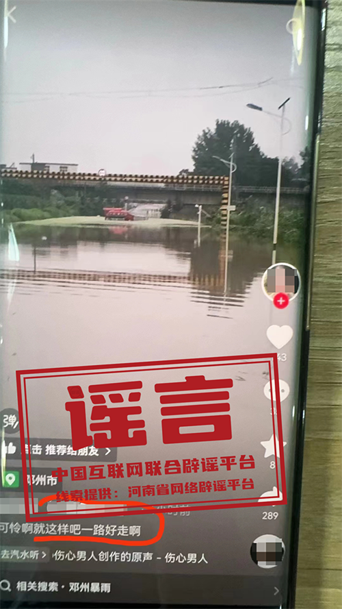7月15日,網(wǎng)民“神x”在某短視頻平臺發(fā)布“貨車司機(jī)被淹”視頻,并配文稱“可憐啊,就這樣吧,一路好走”。經(jīng)核實(shí),7月14日,鄧州市鐵路橋下一外地牌照貨車被淹,車內(nèi)被困人員已被成功救出,無人員傷亡,該信息與事實(shí)嚴(yán)重不符,系虛假信息。