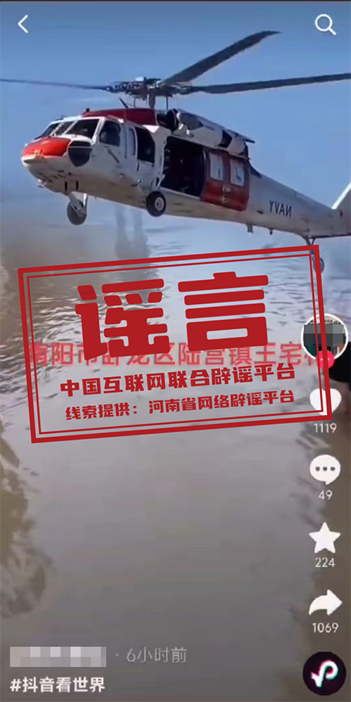 7月15日,網(wǎng)民“賓利xx”在某短視頻平臺發(fā)布視頻稱“南陽市臥龍區(qū)陸營鎮(zhèn)王莊村被水淹,臥龍區(qū)使用直升機(jī)進(jìn)行救援”。經(jīng)核實(shí),臥龍區(qū)未使用直升機(jī)進(jìn)行救援,視頻是發(fā)布者使用軟件拼接而成,系虛假信息。