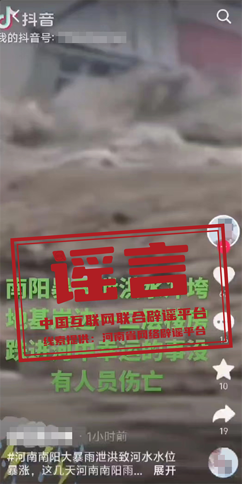 7月15日,網(wǎng)民“憶思xx”在某短視頻平臺發(fā)布視頻稱“南陽暴雨泄洪,水沖垮地基,岸邊一三層樓房跌進(jìn)河中,幸運(yùn)的是沒有人員傷亡”。經(jīng)核實(shí),南陽此次暴雨未發(fā)生房屋被沖塌事件,該視頻為2021年某地暴雨泄洪,致河水水位上漲,岸邊3層樓房轟然倒塌視頻,并非近日發(fā)生的汛情。