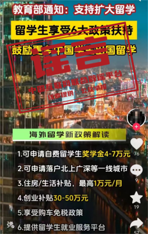 詳情:近日,有自媒體在多個網(wǎng)絡平臺發(fā)布視頻,稱“教育部留學中心召開發(fā)布會宣布‘將擴大支持留學,留學生將享受申請自費留學獎學金、申請落戶一線城市等六大政策扶持’等留學新政策”。對此,教育部留學服務中心7月29日鄭重聲明:該視頻虛假不實,我中心從未召開此發(fā)布會,從未發(fā)布過相關政策。所謂六大政策支持,主要是對部分地方有關政策的拼湊和夸大。請廣大留學生及公眾提高警惕,謹防上當受騙。對此類造謠炒作行為,我中心保留追究相關方法律責任的權利。(來源:“教育部留學服務中心”微信公眾號)
