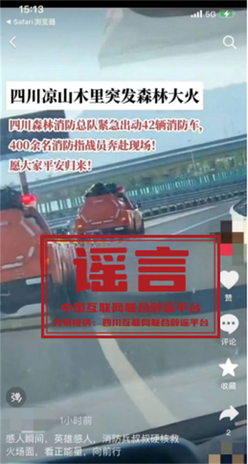 真相:近日,有網(wǎng)民在短視頻平臺上發(fā)布視頻,并配以“四川涼山木里突發(fā)森林大火,四川森林消防總隊緊急出動42輛消防車,400余名消防指戰(zhàn)員奔赴現(xiàn)場”的文字。當?shù)鼐W(wǎng)信部門聯(lián)動應急管理局進行查核,證實四川涼山木里近日未發(fā)生森林大火。(來源:四川互聯(lián)網(wǎng)舉報辟謠平臺)