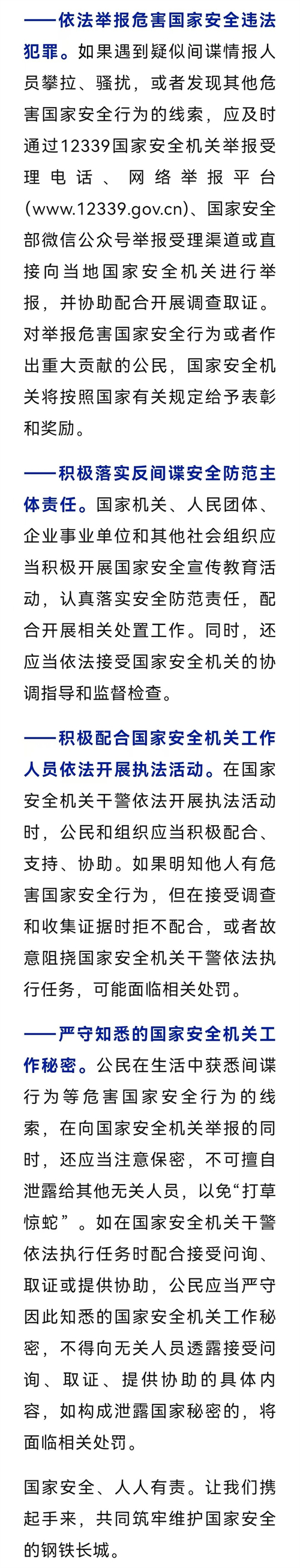 詳情:近年來,國家安全機關在人民群眾支持配合下,有力開展各項工作,堅決維護國家主權、安全、發(fā)展利益!吨腥A人民共和國反間諜法》和《國家安全機關行政執(zhí)法程序規(guī)定》、《國家安全機關辦理刑事案件程序規(guī)定》等法律法規(guī)規(guī)章為人民群眾配合協(xié)助開展國家安全機關工作、共同維護國家安全提供了法律依據(jù)。(來源:“國家安全部”微信公眾號)