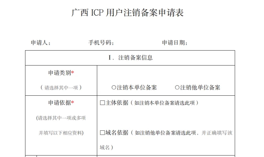 備案注銷需要到備案號(hào)當(dāng)?shù)氐耐ㄐ殴芾砭窒螺d“注銷備案申請(qǐng)表”,按“填表須知”中的要求把申請(qǐng)表里的信息填好,將材料郵寄或送到指定地點(diǎn)即可。處理結(jié)果申請(qǐng)人可自行登錄工信部備案系統(tǒng)“公共查詢”可查詢。以廣西為例: