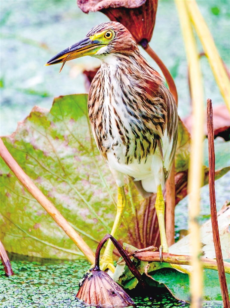 繁殖期頭及頸深栗色,胸醬紫色;非繁殖期背部褐色,頭、頸、上胸部具褐色縱紋,下腹部及翼為白色;嘴基黃而尖端黑色,跗趾黃色。非繁殖期飛行時因白色的腹部和飛羽,易與白鷺混淆,背部有深色陰影是其分辨特征。(來源:安康市林學(xué)會) Ntd安康新聞網(wǎng)