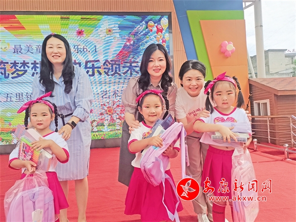 漢濱區(qū)稅務(wù)局為五里鎮(zhèn)幼兒園的小朋友送去書包等文具慰問品。陳榮斌 攝