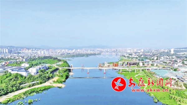 4月16日,安康城東。四橋在靜謐的漢江上倒映出五環(huán),遠處的西城閣和濱江大道與鱗次櫛比的住宅小區(qū)形成了一幅城市風(fēng)景畫。二橋、四橋相互輝映。 陳梅 攝yF4安康新聞網(wǎng)