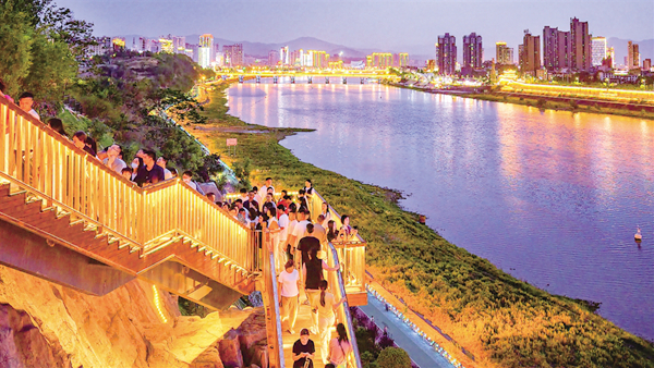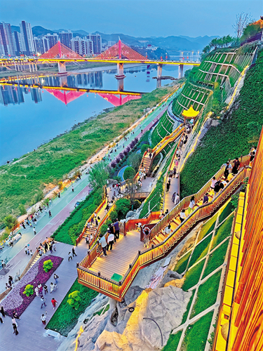 觀瀾亭飛檐斗拱,站在這里可西望月河匯漢江、東瞰碧水穿城過;覽江云臺以鋼結(jié)構(gòu)懸挑凌空18.5米,形成“云端透視”觀江視角;花瀑疊翠垂直落差30米,杜鵑映崖、霧森彌漫,宛如仙境;望川臺將原始排水溝改造成“人工天成”的塑石景觀,周邊景色盡收眼底。