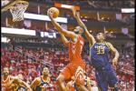 當(dāng)?shù)貢r(shí)間11月5日,火箭隊(duì)球員哈登(上左)在比賽中突破上籃。當(dāng)……