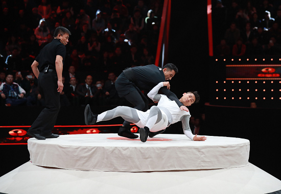 推下擂臺(tái),背部著地,雙雙摔出場(chǎng)外……兩位70公斤級(jí)選手率先登場(chǎng),剛?cè)岵?jì)中體現(xiàn)力量與技巧,比賽節(jié)奏緊張、勝負(fù)扣人心弦。豐富的技術(shù)動(dòng)作,復(fù)雜的勁道變化,讓熟悉跆拳道、柔道和拳擊的觀眾,見(jiàn)識(shí)了不同于摔、打、踢的太極技擊,現(xiàn)場(chǎng)歡呼加油聲不斷。