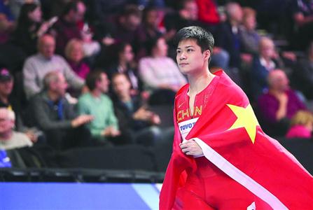 當(dāng)成績顯示在大屏幕上,蘇炳添揮拳慶祝這來之不易的獎牌,他從看臺上接過一面五星紅旗,身披紅旗繞場一周慶祝勝利。