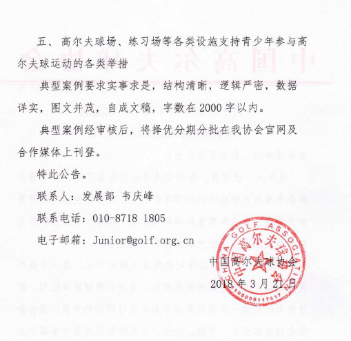 人民網(wǎng)北京3月22日電(楊喬棟)昨天,中國高爾夫球協(xié)會發(fā)布《關(guān)于征集青少年高爾夫球運(yùn)動典型案例和成功經(jīng)驗(yàn)的公告》(簡稱“公告”)。公告指出,在高爾夫球協(xié)會實(shí)體化改革深入推進(jìn)之際,青少年高爾夫球運(yùn)動又迎來了新的發(fā)展契機(jī)。為充分釋放改革紅利,抓住有利時機(jī)進(jìn)一步推動青少年高爾夫球運(yùn)動的發(fā)展,我協(xié)會向全社會各團(tuán)體、學(xué)校、企業(yè)、個人征集開展青少年高爾夫球運(yùn)動的典型案例,以期達(dá)到廣泛傳播成功經(jīng)驗(yàn),了解行業(yè)發(fā)展?fàn)顩r,為制定行業(yè)發(fā)展政策提供參考的目的。