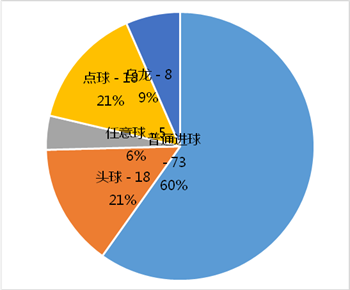本屆世界杯關于進球的另一個感受就是點球的增加,由于VAR視頻助理裁判技術的引入,本屆世界杯小組賽共打進了18粒點球,而任意球直接破門也有5粒,均超過了上屆世界杯;而從進球方式來看,定位球(直接任意球和點球)的直接破門共有23粒,依靠定位球(任意球和角球)戰(zhàn)術打入的進球有27粒,而依靠運動戰(zhàn)打入的進球有72粒;