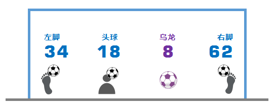 本屆世界杯小組賽中球員用右腳打入62粒進球、左腳34粒、有18粒進球是用頭球打入(未統(tǒng)計8粒烏龍球的踢球部位),而進球方式中,除普通進球方式外,點球和頭球各打入了18粒進球。