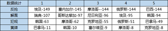 本屆世界杯小組賽的主要防守數據統(tǒng)計如下: