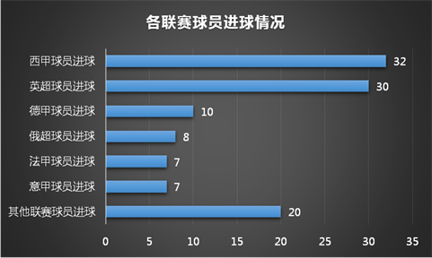 從小組賽進球的球員所屬聯(lián)賽分布來看,來自14個國家的21名西甲球員包辦了最多的32粒入球,英超球員打入了30粒進球排名第二,來自五大聯(lián)賽的德甲、法甲、意甲球員分別打入了10粒、7粒和7粒,值得一提的是,來自3個國家的5名俄超聯(lián)賽球員共打入了8粒進球,排名第4,而來自廣州恒大淘寶的韓國球員金英權是中超球員打入世界杯入球的唯一球員。