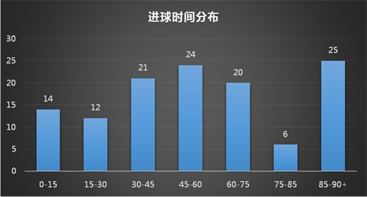 本屆世界杯讓大家印象深刻的是出現了多場比賽的絕殺與絕平的比賽,而從進球時間分布來看,也印證了這一點,據統(tǒng)計,在比賽的85+分鐘進球的數量達到了25粒,占總進球的20.5%,其次是下半場開場后的15分鐘,進球數達到了24粒。