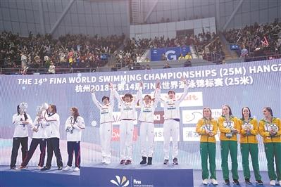 今晚,杭州2018年第14屆FINA世界游泳錦標(biāo)賽(25米)決出了7個(gè)項(xiàng)目的金牌,其中,李冰潔、楊,u、張雨涵、王簡嘉禾組成的中國女隊(duì)以7分34秒08的成績打破亞洲紀(jì)錄,力壓美國隊(duì)和澳大利亞隊(duì)奪得了女子4×200米自由泳接力的金牌,這是中國游泳隊(duì)在本屆短池世錦賽上的第3枚金牌,也是王簡嘉禾個(gè)人第2枚金牌。