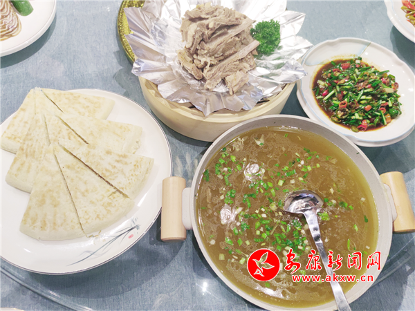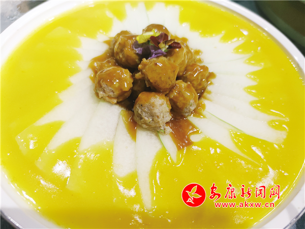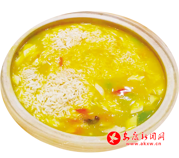這是一道舌尖美味,制作時(shí)提前把海參、青筍、杏鮑菇、紅蘿卜切好汆水,備好墨魚(yú)花、蝦仁、棒骨高湯、南瓜泥、咸蛋黃,炸好香米,客人餐前,把炸好的香米復(fù)炸香脆裝盤(pán),再把雞油、咸蛋黃、高湯和南瓜泥放入鍋內(nèi)翻炒,然后倒入海參、青筍、杏鮑菇、紅蘿卜、墨魚(yú)花、蝦仁等食材,燒開(kāi)勾芡,調(diào)制成濃香金湯,起鍋裝盆,端到客人餐桌,當(dāng)著食客的面將脆米倒入盛裝金湯的土盆里,攪拌均勻即可。這道菜看著五顏六色、金黃油亮,吃著養(yǎng)胃養(yǎng)顏,湯汁鮮美,營(yíng)養(yǎng)豐富。