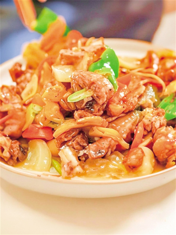 曬干的土豆片用水泡發(fā)喚醒,這看似簡單的步驟暗藏玄機。浸泡時間短則發(fā)硬,久則軟爛,唯有經驗老到的廚娘能把握分寸。“復活”的土豆片帶著陽光的甘甜與泉水的清冽,在雞肉煸出琥珀色時傾入鍋中,與郫縣豆瓣醬、蒜頭姜片共舞。當褐紅色的醬汁裹滿每塊食材,撒入的野蔥段。炒好裝盤,色澤焦黃的雞肉混合著金黃的土豆片,點綴著翠綠的野蔥段,紅亮的醬汁如絲般纏繞其間,讓人垂涎欲滴。雞肉外皮酥脆而內里肉質鮮嫩多汁,與土豆片的軟糯完美融合,帶來層次分明的口感享受。辛香與醬香交織,激發(fā)著味蕾的無限遐想,讓人一嘗難忘,也成了安康人飯桌上一道備受歡迎的美食。AEJ安康新聞網