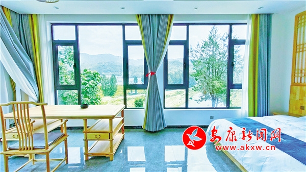 半山腰的獨(dú)棟別墅白墻黑瓦,飛檐峭壁,處處滲透著平淡質(zhì)樸的古典韻味;张山ㄖ骋星嗌,面朝峽谷,壩河水在谷間緩緩流淌。別墅里每一間都布置得精致高端,站在二樓落地窗前,觀連綿青山,賞花鳥飛禽,讓人陡然間心靜如水。