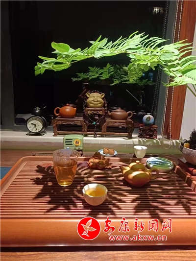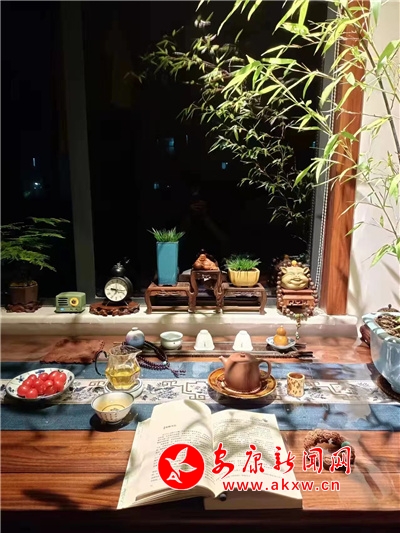 次日,我便聯(lián)系他,欲欣賞一下他的書房陳設(shè),他欣然允之,發(fā)了書房的照片。但見潔凈的白色窗臺(tái)上擺放著清秀的文竹、蔥綠的石菖蒲、一尊笑容可掬的彌勒佛、精巧小豬擺件上系著一串佛珠,雞翅木書桌上擺放著古樸典雅的茶具旁擺置一株紫竹。彼時(shí),許是他正品著香茗,展卷而讀,然后進(jìn)入一個(gè)縱橫千萬里,上下幾千年的世界。徐徐夏風(fēng),紫竹搖曳,竹影映射于書,似也愜意。