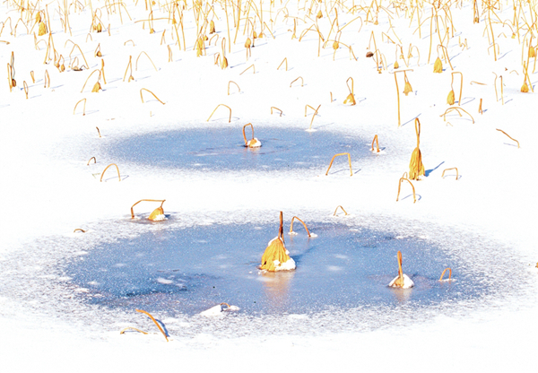 我的攝影創(chuàng)作圍繞生命的痕跡、時(shí)間的隱喻兩個(gè)主題。在《嘉實(shí)擷芳·野圃瑤音》中,菜園的微觀生態(tài)被賦予交響樂般的節(jié)奏——葫蘆藤的螺旋曲線是生命的律動(dòng),西紅柿根莖的垂直排列是生長(zhǎng)的秩序,蚜蟲蝕痕的細(xì)節(jié)則暗喻生態(tài)的共生與抗?fàn)。而在《澄漪棹?middot;沙月溯光》里,榮成海岸的冬夏對(duì)比成為時(shí)間的隱喻,結(jié)冰湖面上的凋敗蓮蓬是流逝凝固的時(shí)光,夏日海邊的金色水洼則是流動(dòng)的永恒。我癡迷于捕捉這種矛盾與共生——就像用冷暖色調(diào)碰撞出畫面的張力,也用虛實(shí)構(gòu)圖處理每一張照片,期待每一張照片是個(gè)性鮮明,讓人耳目一新。